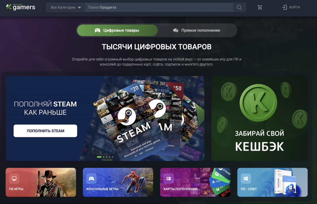 Keysforgamers (KFG) — крупный маркетплейс и онлайн-магазин цифровых игр и ключей. Платформа предлагает широкий ассортимент продуктов для геймеров и уже имела высокий уровень узнаваемости и спроса до начала сотрудничества с нами.